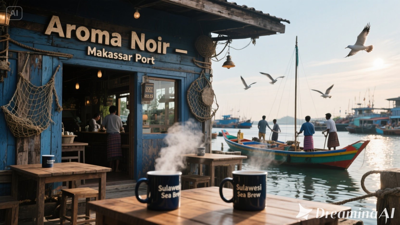Menghadap langsung ke pelabuhan, gerai Makassar kami punya energi maritim yang kuat. Dinding kayu kapal tua, jaring ikan sebagai dekorasi, dan aroma kopi yang kuat — semua mencerminkan jiwa petualang kota ini. Banyak nelayan dan pelaut mampir sebelum berlayar — mungkin untuk cari keberuntungan, atau sekadar hangatkan badan. Coba “Sulawesi Sea Brew”, racikan khas dengan biji Toraja yang bold dan earthy.