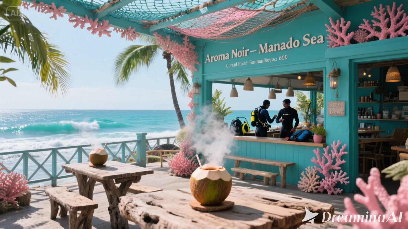 Dikelilingi aroma laut dan angin sepoi-sepoi, gerai Manado kami adalah tempat terbaik untuk memulai hari. Dengan dekorasi bertema laut — karang, jaring, dan lukisan ikan — suasana di sini segar dan menyenangkan. Banyak penyelam dan turis yang mampir sebelum ke Bunaken — untuk sarapan dan kopi penyemangat. Coba “Coral Reef Brew”, racikan dengan sentuhan kelapa muda yang menyegarkan.